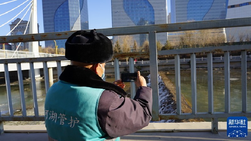 青海省西宁市城西区兴海路街道办事处河道专职巡查员邵守文在巡河过程中拍摄照片。(2021年12月13日摄)新华社记者 李宁摄