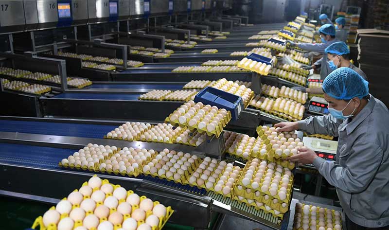 山西晋龙养殖股份有限公司工人在自动化分拣线上包装鸡蛋。新华网 发