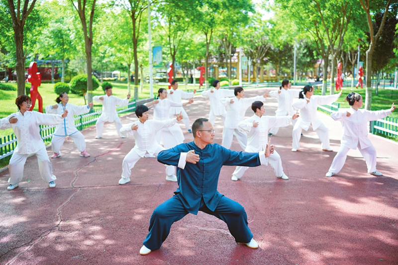 图为健身爱好者在运城市体育公园练习八段锦,乐享健康生活。闫鑫 摄