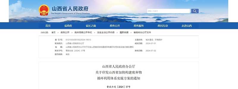 近日,记者从山西省人民政府官网获悉,为贯彻落实国务院《推动大规模设备更新和消费品以旧换新行动方案》(国发〔2024〕7号)、国务院办公厅《关于加快构建废弃物循环利用体系的意见》(国办发〔2024〕7号)及山西省政府《推动大规模设备更新和消费品以旧换新实施方案》(晋政发〔2024〕10号)精神,深入实施畅通资源循环利用链条行动,加快构建废弃物循环利用体系,山西省人民政府办公厅发布《关于印发山西省加快构建废弃物循环利用体系实施方案的通知》(以下简称“通知”)。