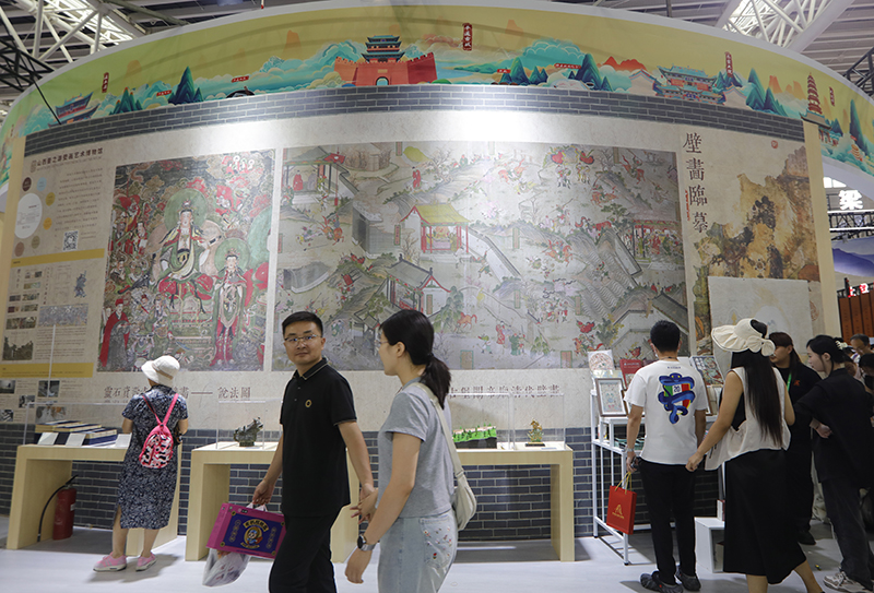 最引人注目的是高4米的灵石资寿寺壁画复原图和介休张壁古堡关帝庙壁画复原图,壁画采用宣绒布喷绘技术精准还原,线条粗简豪放中见力道,色彩浑厚沉稳里显古韵。一旁,来自山西晋之源壁画艺术博物馆的壁画修复师正在现场演示壁画临摹的工艺流程和技术要点,让观展者直观了解这一传统技艺的精髓。