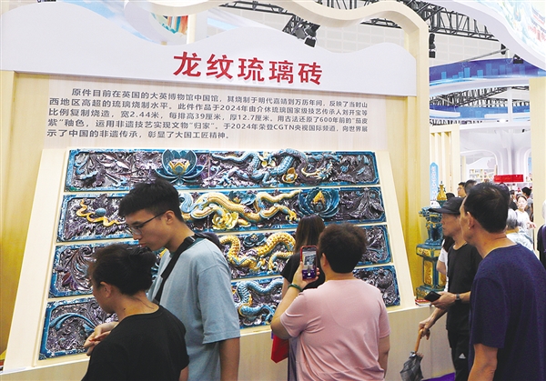 在晋中展区的核心位置,一组龙纹琉璃砖的釉色闪耀着深邃的光泽,釉色流转间,茄皮紫与孔雀蓝交相辉映,高浮雕的龙纹栩栩如生,仿佛下一秒就要破壁而出。这组复烧的明代琉璃珍品,以其精湛工艺引得观众纷纷驻足。