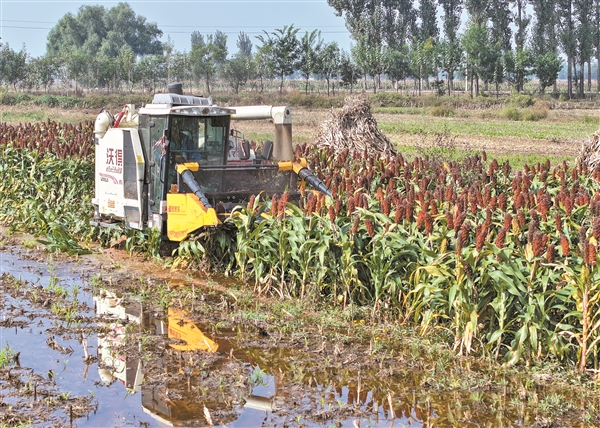 平遥县宁固镇丰依村农机手驾驶履带式收割机抢收高粱,确保应收尽收,颗粒归仓。 本报通讯员 梁生仁 摄