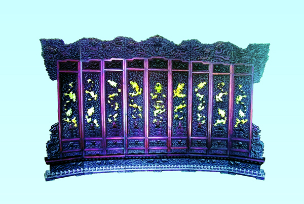 九龙屏风 屏风高2.7米、长4.07米,用花梨木雕刻而成。屏风中间的九条龙用岫玉镶嵌,雕刻工艺精湛细腻,颇有飞龙在天、栩栩如生的韵味。屏风上,除9条大龙外,周围还雕有72条小龙。小龙形态各异,若隐若现,交错盘绕,参差有致。整个屏风做工精巧,是乔家大院里一件价值连城的镇宅之宝,有极高的观赏价值和研究价值。
