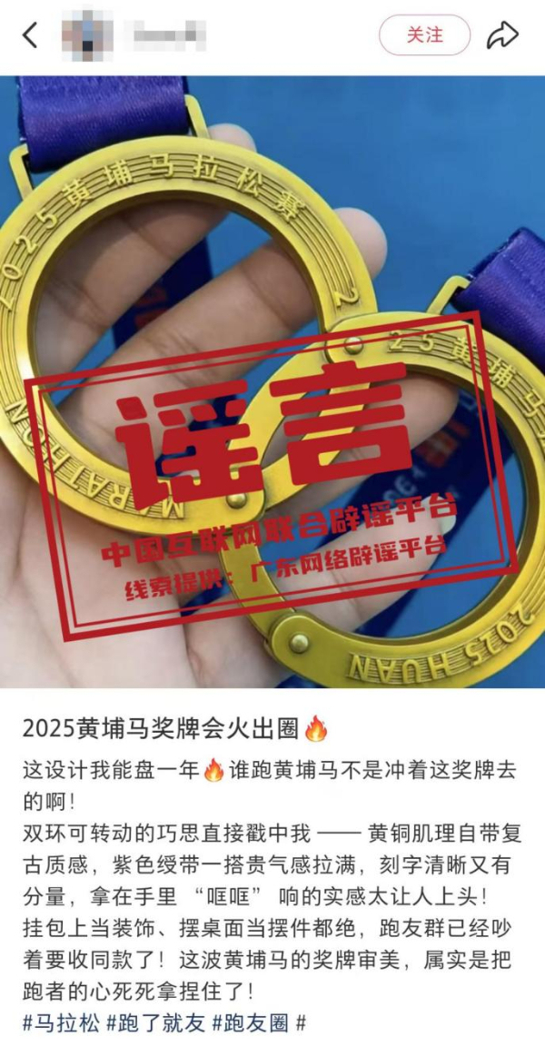 详情:近日,网传“2025黄埔马拉松完赛奖牌为手铐型”消息引发关注。对此,2025黄埔马拉松赛官方组委会回应称该信息不实。网传图片疑似系P图或AI生成。据悉,2025黄埔马拉松完赛奖牌为圆环结构,其设计灵感源于精密齿轮轴承,致敬黄埔深厚的制造业根基。奖牌中央的圆环内圈镌刻的开拓者雕像、科学城地标、知识城九龙湖等图案,在同轴转动时可交替显现,宛如一条缩微的“城市发展能量带”,隐喻着个人拼搏精神与城市前进动力的同频共振,实物并不能如网传图片那样打开并呈现“手铐型”。(来源:“广东省互联网举报中心”微信公众号、南方网)