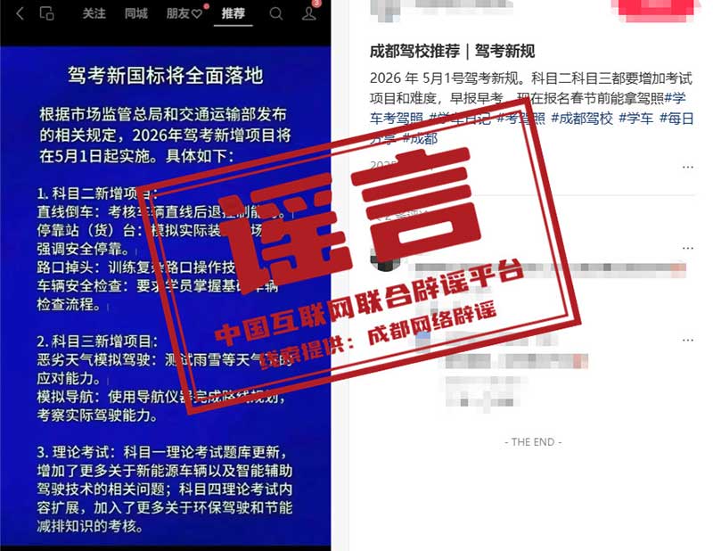 详情:近日,有网传消息称,C2驾照科目二考试将于2026年5月1日起新增考试项目。针对该传言,成都交管部门在回应网友咨询时明确表示:截至目前,未接到相关主管部门关于C2科目二新增考试项目的正式通知与部署安排,网传相关信息均非官方发布。所谓“新增直线倒车、停靠站台、路口掉头、车辆安全检查”等内容,多为驾培行业训练建议或不实传言,并非法定考试项目。(来源:“成都网络辟谣”微信公众号)