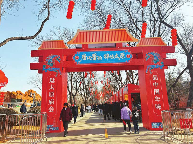 门票检录处,红彤彤的春联与福字挂满廊檐,年味扑面而来。“第十二届太原庙会于正月初一至正月十六在此举办,主题为‘锦绣太原城·欢聚中国年’。”工作人员介绍,本届庙会精心策划了民俗演艺、非遗展示、美食游乐等一系列特色活动,为市民游客奉上别样的新春盛宴。