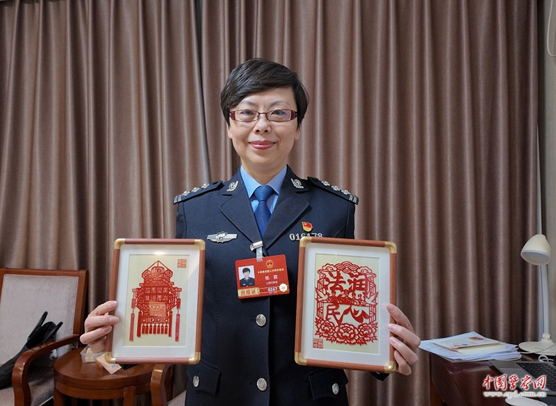 剪纸画中,红彤彤的灯笼上,“晋善警美”“法润民心”几个字格外醒目。杨蓉一边展示非遗作品,一边介绍山西“非遗+法治”工作成效:“2025年,山西公安紧扣‘晋善警美’思政品牌建设,结合‘阳光下的守护’法治公安主题宣传活动,创新‘非遗+法治’宣传模式,巧妙运用阳城鼓书、左权民歌、阳泉剪纸等非遗形式,常态化开展普法宣传,全省电诈预警劝阻率得到有效提升……”